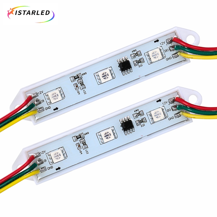 Digital rgb pixels are controlled lights you can program any effects or animate.Each digital pixel with rectangle PVC plastic and contains 3 RGB SMD5050 LEDs and a UCS1903 chip soldered to the PCB.The rectangle pixel module is them glued on the surface to make it waterproof.Those pixel module also have nice mounting options, for examples, each chain with 3M adhesive tape on the backside to help installing,you can put the pixel module into signs, so those pixel modules are typically used to make indoor and outdoor signs.Also each pixel module have 2 small 4mm diameter holes on the ends. They also can make large RGB pixel displays and dance stages,KTV floors.