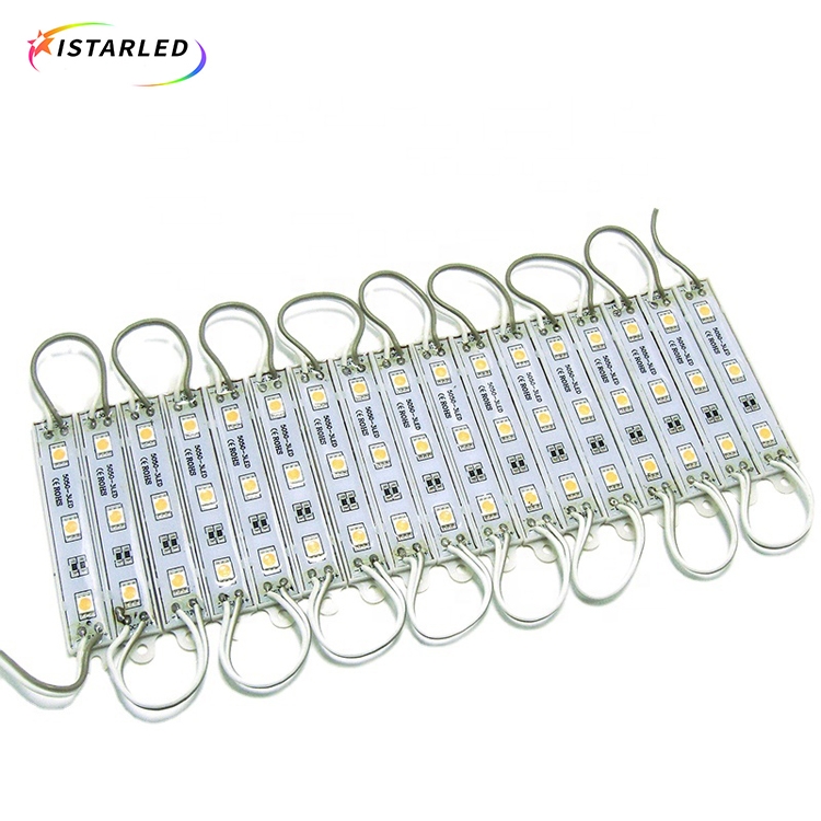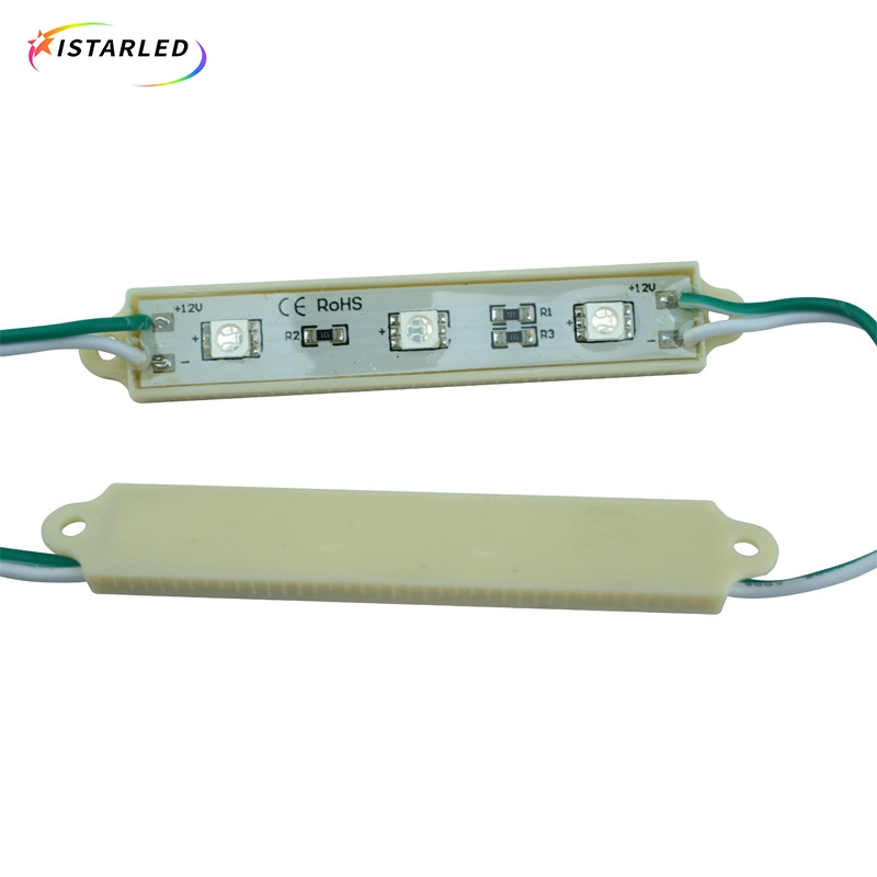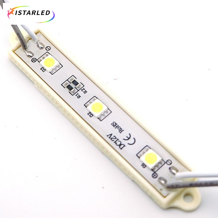 This module is single color led module,one pcs made by 3pcs smd5050 led lamp,drived by 12v,the put pcb into 75x12 plastic case,then glue on the surface,so it is waterpproof version . This is single color module,and we can do warm white, pure white,blue, green ,red,yellow.