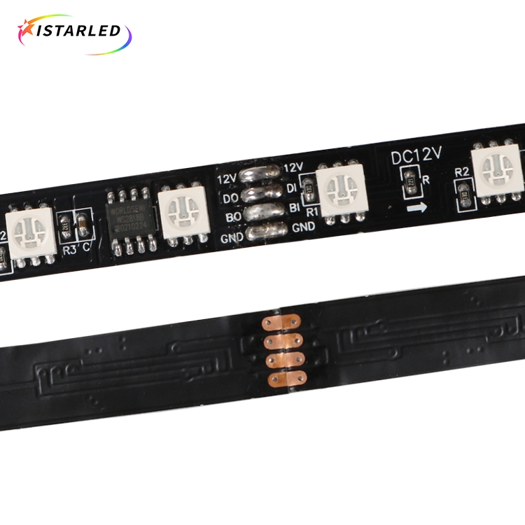 The 12v ws2818 flexible led strip is 4 solder pads on the PCB,that is,12V+,DATA,BI,GND,which is double DATA,the advantage of double data is that when one ic chip broken,other leds can still keep working, also called Signal break-point continuous transmission.