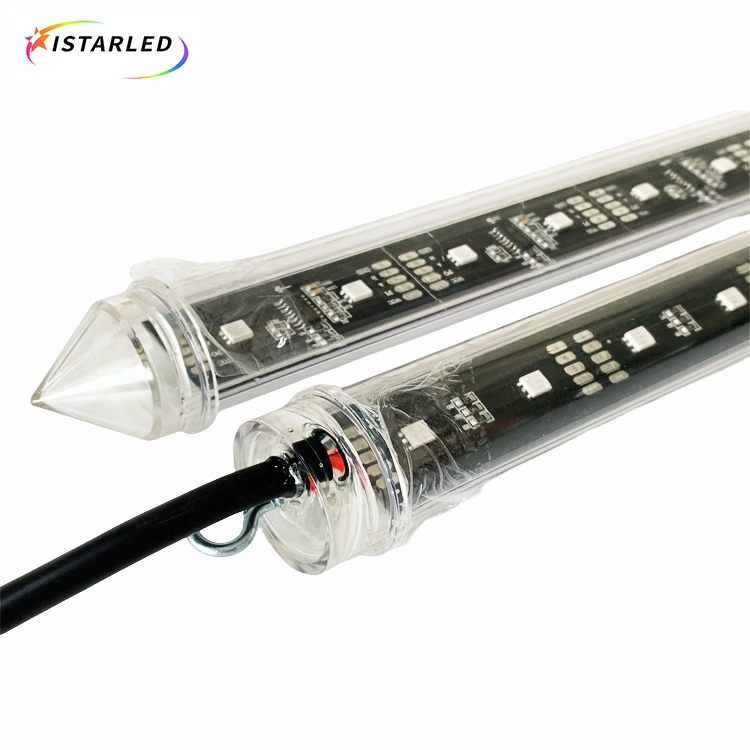 1.This 360degree 3D DMX vertical led meteor tube light is made by 30mm diameter PVC cover . Inside pcb is made by dmx512(ucs512) ic chip with each 4led smd5050 rgb led lamp(each side with 32leds,total 64leds).This 3D dmx led vertical tube light is dmx512 signal,which is parallel instead of SPI signal.
