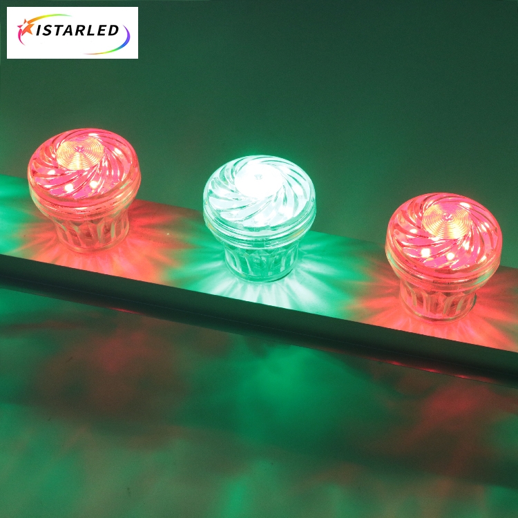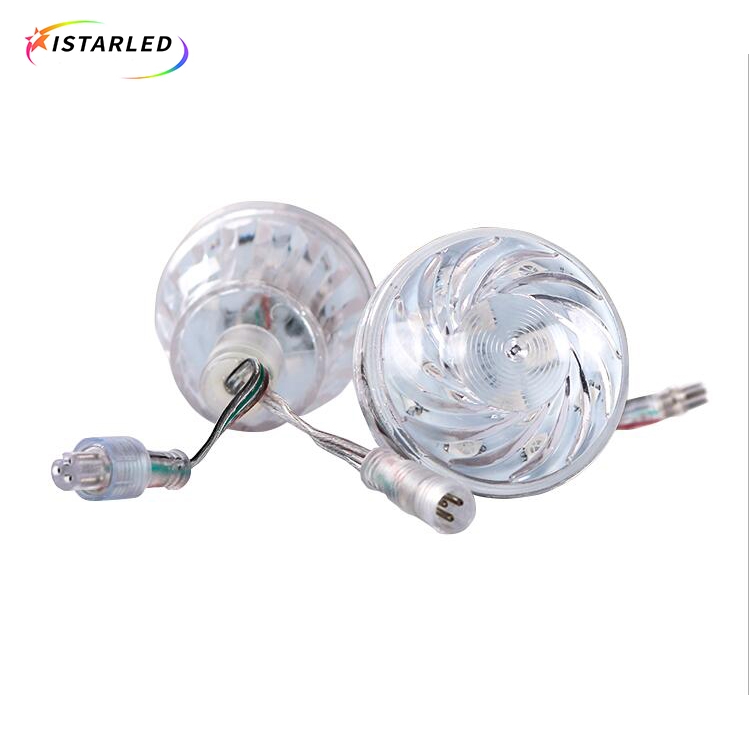 This 60mm 18leds cabochon 360degree rgb pixel led is made by 18pcs smd5050 rgb led(frontside with 12leds,backside with 6leds) with one pcs ucs1903 ic chip,drived by 24v, for the backside install hole we can do 19mm hole hole. The glue inside from backside, so leds are fully waterproof.Normal it is with 3Pin JST SM female and male connectors with 8cm for each pixels,so you can plug them together as the quantity you need, just remember to recharge power every 20pcs. Also we can provide 20pcs with one pcs have extra power cable. And if you want to use them in outside, please tell us before order, then we can do them with waterproof plugs.