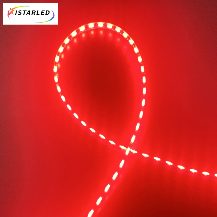 Those double side emitting light sk6805 5720 led strip is only 5mm pcb,we do them with 3 OZ copper pcb. Normal with 5m/roll,each end with 4Pin naked cables.