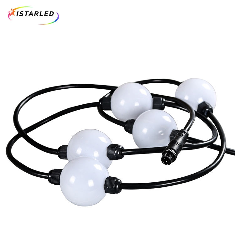 The 3D SPI 50mm led ball is normal made by 20pcs per string,also we can do custom length.And Each string of pixel led ball have 3Pin female and male waterproof connectors on each ends. So each chain you also need T power cable to recharge power when using.